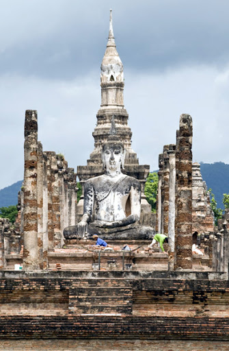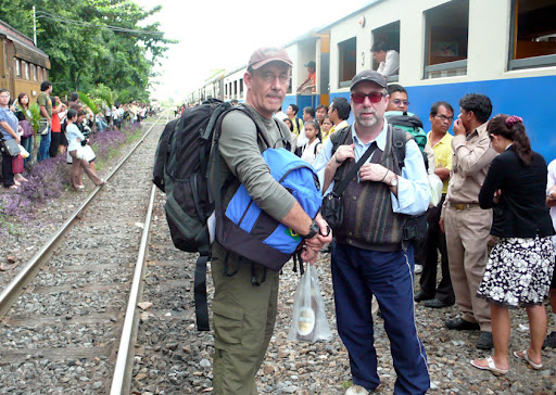 A poluição visual merece um capítulo à parte, prometo falar mais tarde.A linha férrea, que atende o suburbio, por exemplo, tem de um lado uma loja de Ferraris e Lamborguinis, do outro, casebres sobre palafitas.O rei , muito querido pela população, exerce o poder moderador entre a abundante mão-de-obra e o apetite das multinacionais. Celular aqui é que nem bunda, todo mundo tem e funciona. No trem de segunda classe a caminho de Aythaya, comecamos a ver a verdadeira Thay que não é uma Bangkok. As cidades dormitórios, a miséria e a poluição se instalam ao longo da ferrovia. Gastamos 3 h para percorrer 60km até a nossa primeira parada ( Ayuthaya ), com direito a baldeação e tudo.